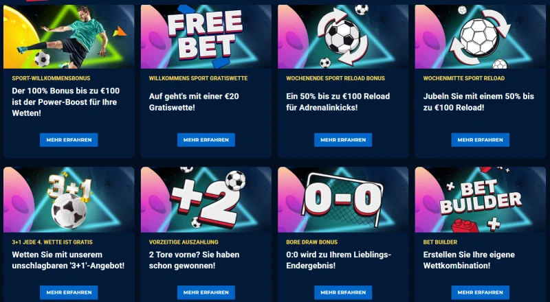 Nach Ihrem Willkommensbonus konzentriert sich JupiCasino weiterhin auf Sportwetten-Belohnungen zu den Zeiten, an denen Sie am wahrscheinlichsten wetten – geschäftige Wochenenden, Spiele unter der Woche und Mehrfachwetten. Unsere Reload-Boni sind unkomplizierte Aufladungen für qualifizierte Einzahlungen, während unsere Feature-Promos praktischen Mehrwert bieten, wie die Abrechnung Ihrer Wetten und das Zusammenstellen von Auswahlen.