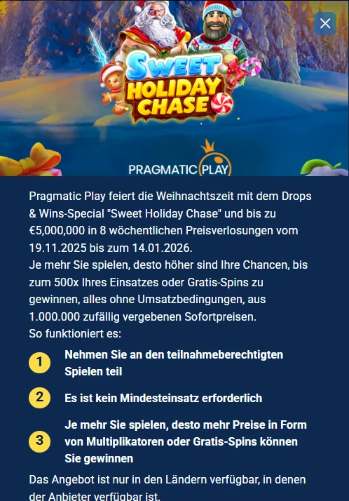 Jupi Casino veranstaltet auch zwei große Slot-Event-Formate, die reguläres Spielen in eine Saison-Herausforderung verwandeln – ohne Mindestwetten zu erzwingen. Das erste ist Sweet Holiday Chase, ein festliches „Drops & Wins“-Special mit acht wöchentlichen Preis-Drops vom 19.11.2025 bis 14.01.2026 und einem Preispool von bis zu €5.000.000 während des Events.