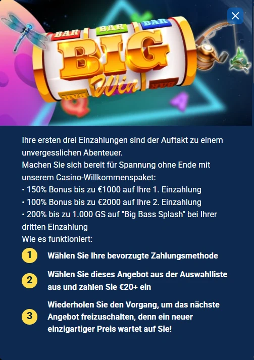 3. Einzahlung: 200% bis zu 1000 Freispiele auf Big Bass Splash
